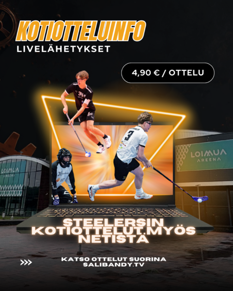 Kotiotteluita seuraat myös verkosta. Salibandy.tv:n kautta näet Steelersin kotiottelut: 4,90€ / ottelu.